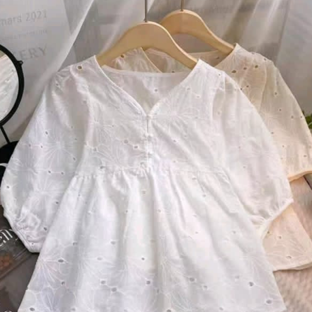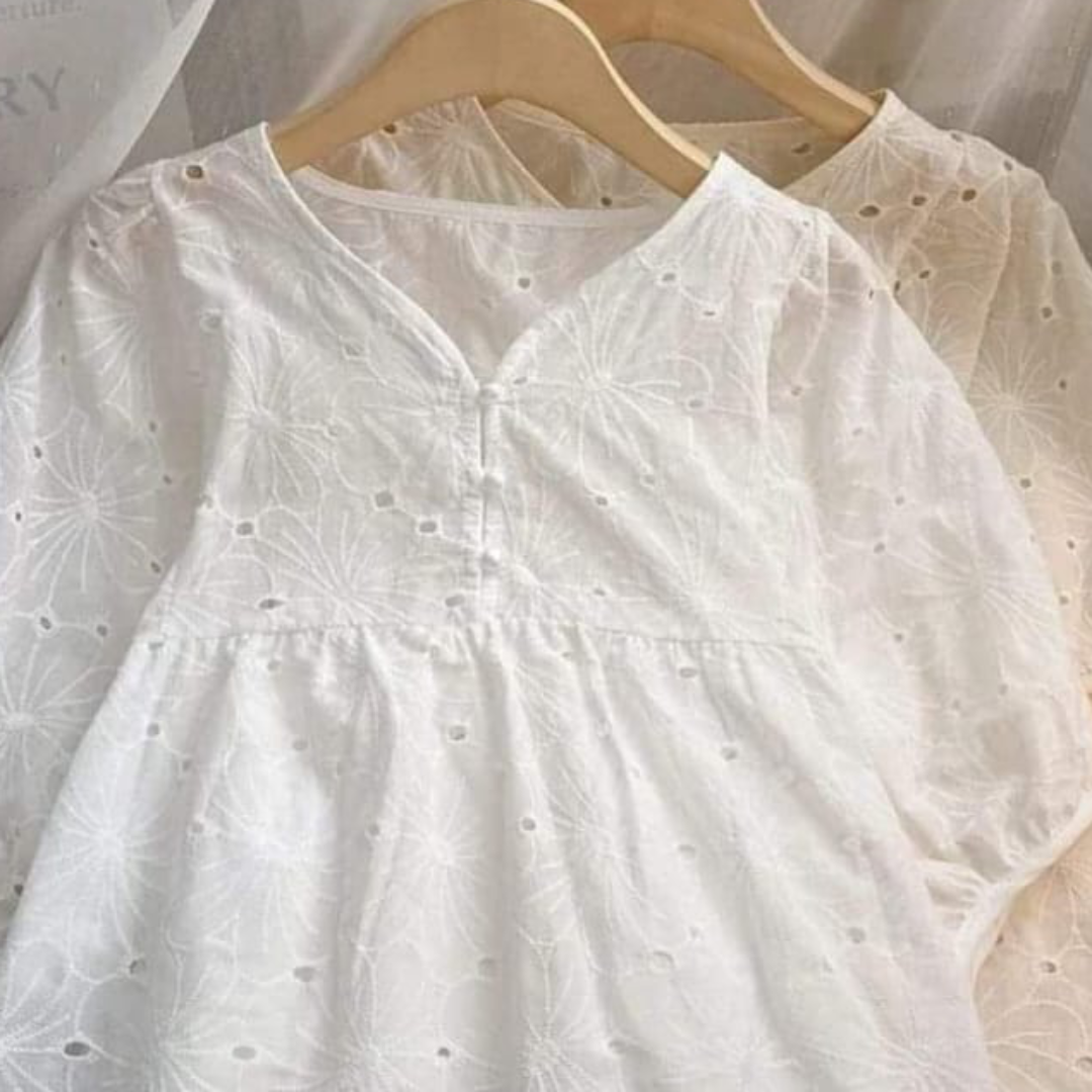 Korean V-neck Pure Cotton Hollow Doll Puff Elegant Summer Tops
